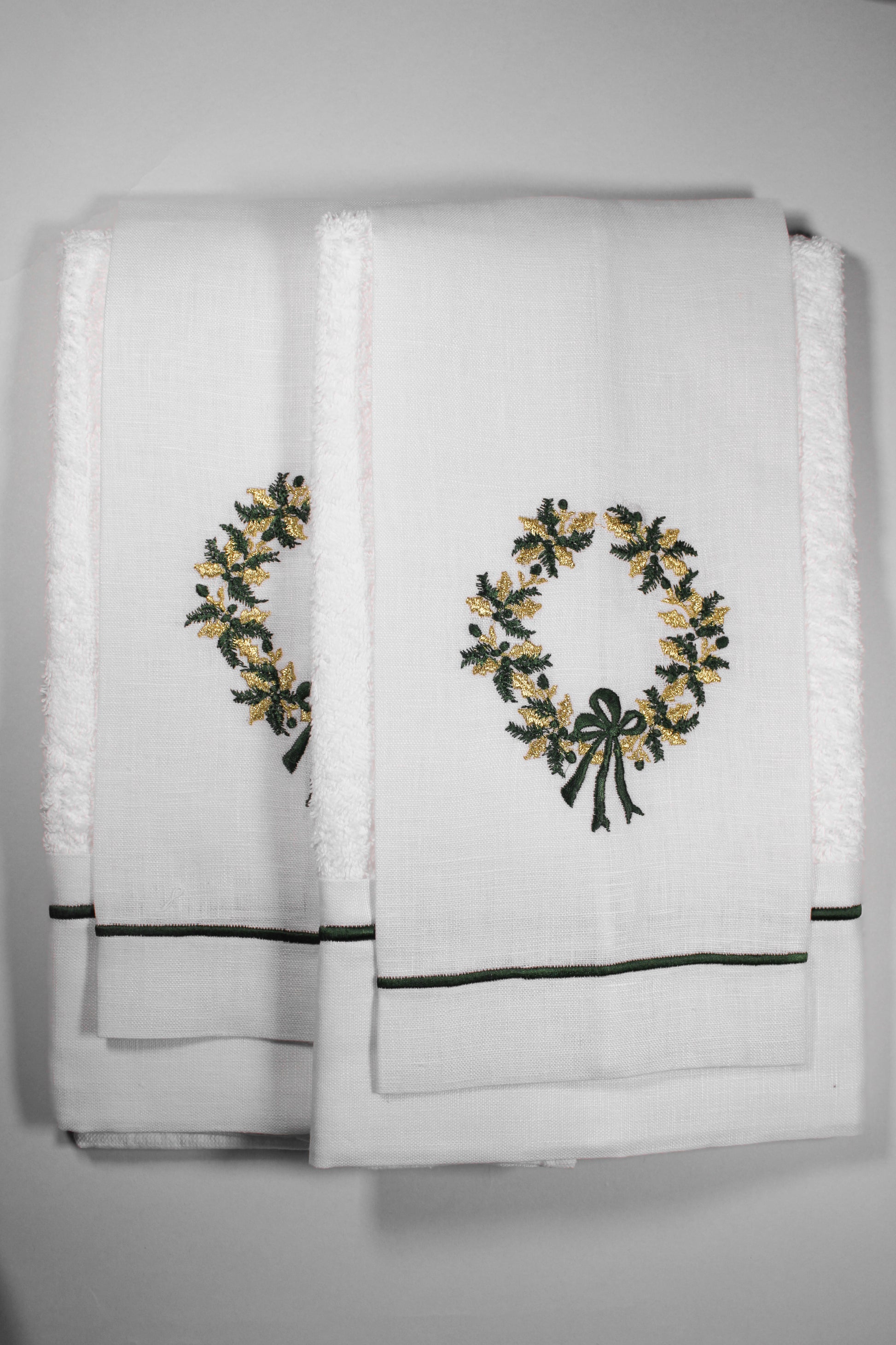 JGO 4 TOALLAS DECORATIVAS BORDADAS CORONA PLATEADA/DORADA MOÑO VERDE