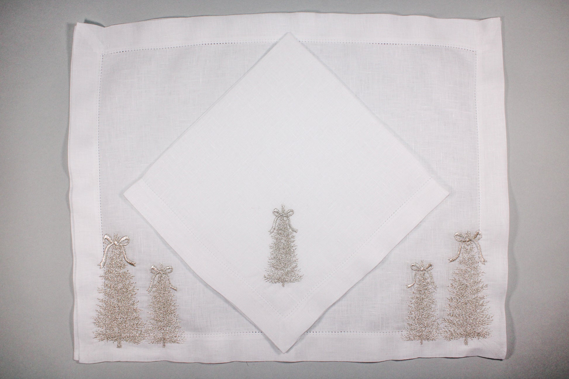JGO DE 4 INDIVIDUALES Y 4 SERVILLETAS PREMIUM ARBOL MOÑO PLATEADO Eu. 100% LINO BORDADO