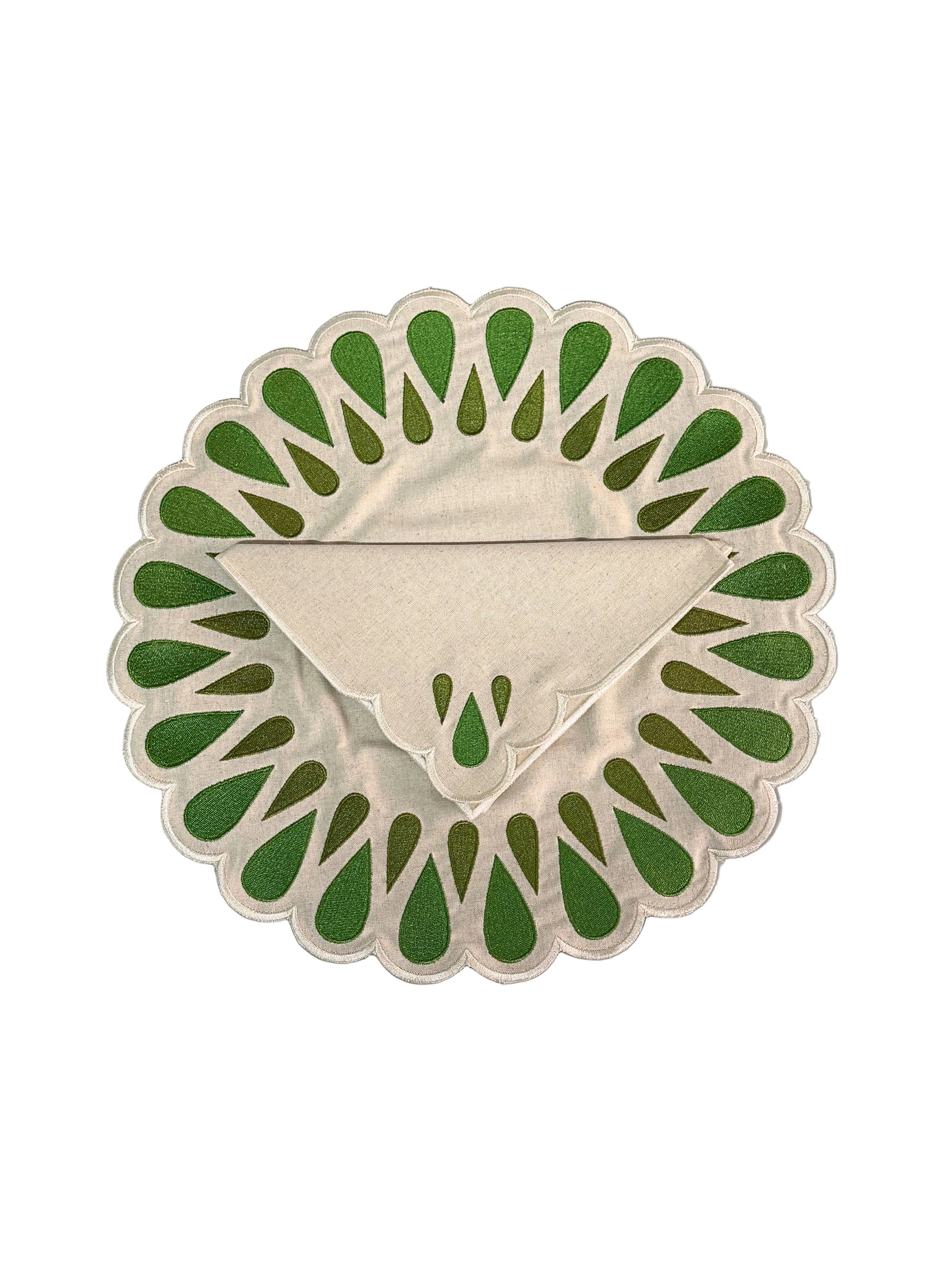 Juego de 4 individuales y servilletas en modelo gota en tonos verdes con mezcla de lino poliester en tono verdes.