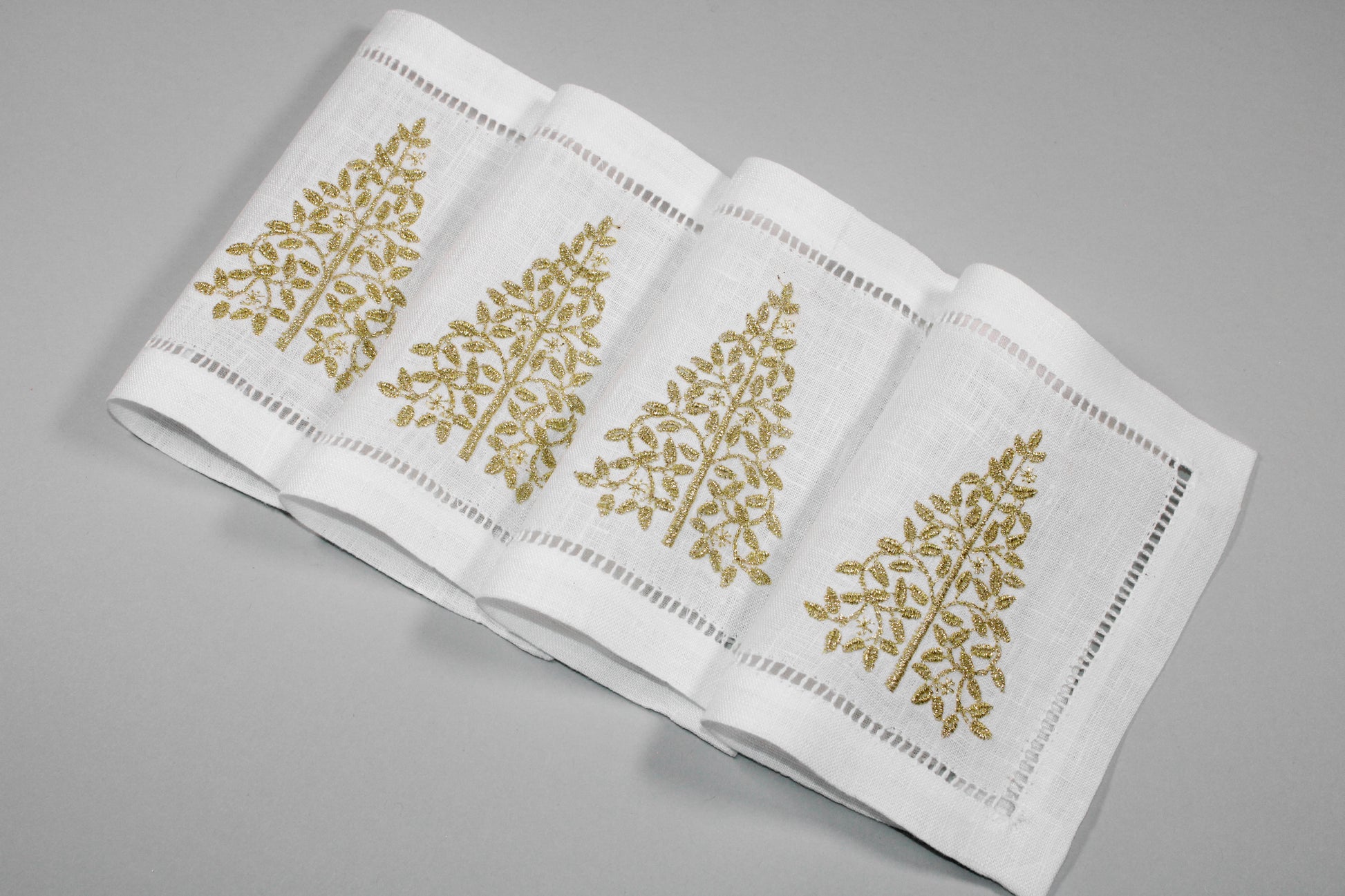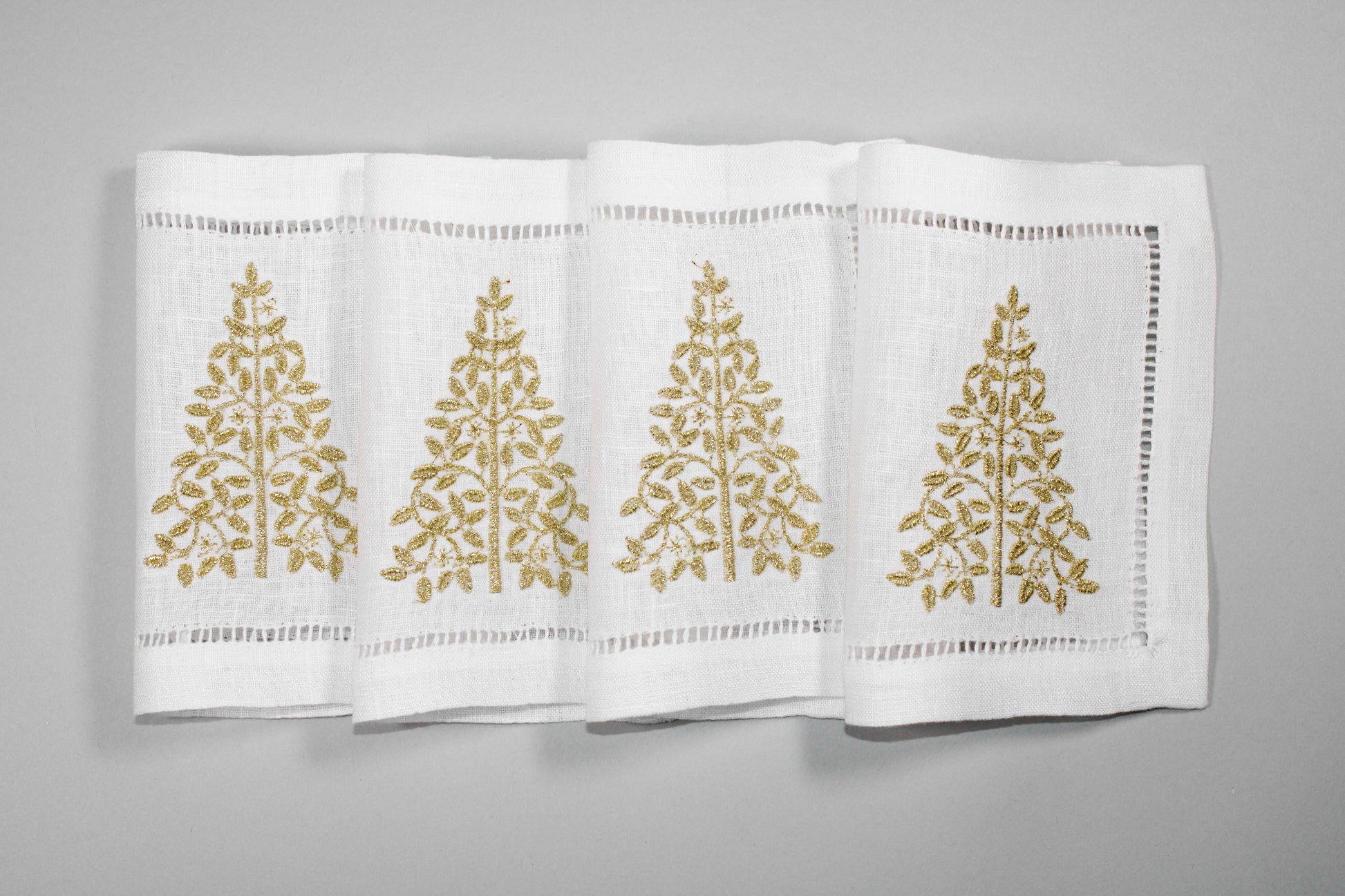 Juego de 4 servilletas cocteleras rectangulares de lino con diseño de árbol dorado.